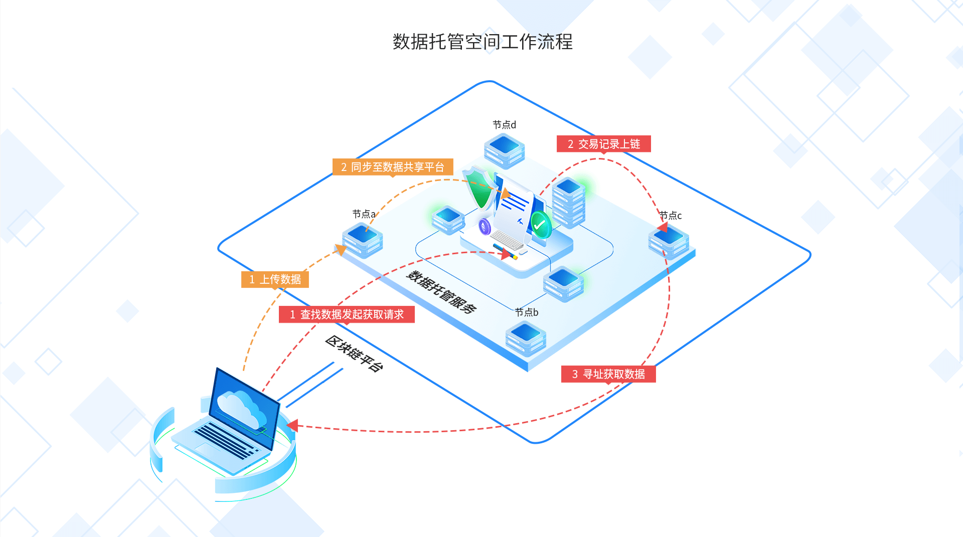 数据托管基于QID质量码标识,多主体间可以实现数据的授权共享,共享主体将数据锚定于统一标识体系,并通过标识解析操作由第三方获得共享数据,所有过程通过区块链平台进行存证,保障数据可信与过程安全